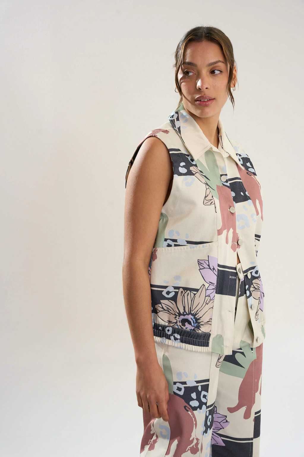 DESCRIPCIÓN:El chaleco está confeccionado en sarga estampada, posee siete botones metálicos al frente, cuello camisero y viene con elástico en el borde inferior. El largo es hasta la cadera, tiene dos bolsillos al frente y una badana personalizada en la espalda baja.