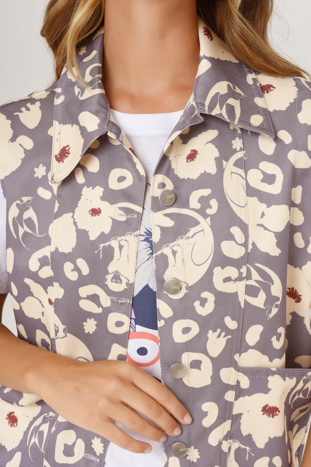 DESCRIPCIÓN:El chaleco está confeccionado en sarga estampada, posee siete botones metálicos al frente, cuello camisero y viene con elástico en el borde inferior. El largo es hasta la cadera, tiene dos bolsillos al frente y una badana personalizada en la espalda baja.