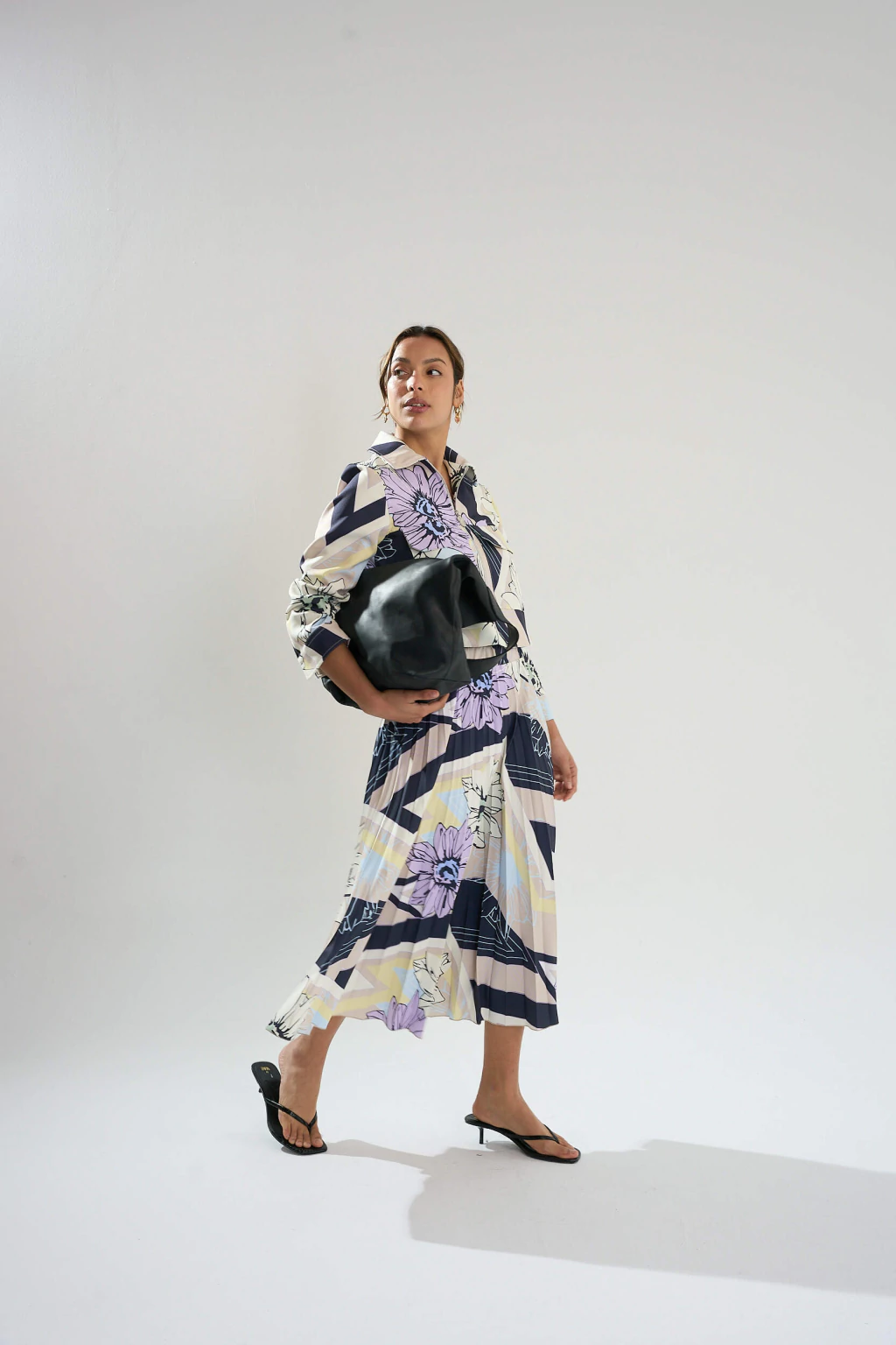 DESCRIPCIÓN: La falda plisada Luis está confeccionada en sedita verona estampado, tiene elástico en la cintura y el largo midi ideal.