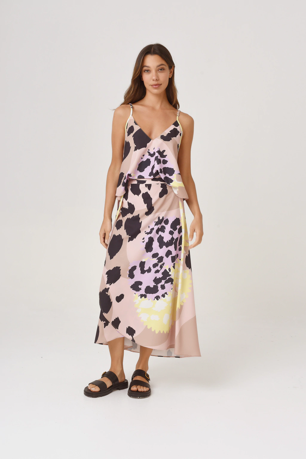 Ninguna otra prenda dice verano más que esta falda. Corte portafolio con tiras para ajustar y acomodarla a cada cuerpo. Es larga por debajo de las rodillas, con una presilla para un mejor ajuste en la cintura y con terminación redondeada en la parte inferior. Confeccionada en Crepe Ariana, con mucho vuelo y súper fresco para el verano.