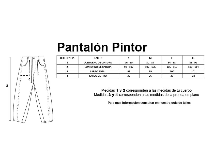 DESCRIPCIÓN: El pantalón Pintor es corte carrot (amplios en los muslos y progresivamente más estrechos acercándose al tobillo), su calce es amplio y con cintura media. Está confeccionado en gabardina 8OZ y agregamos una badana de ecocuero con nuestro logo en la espalda alta. El largo es hasta los tobillos y tiene bolsillos al frente y en la espalda. El modelo tiene presillas para usar cinturon.